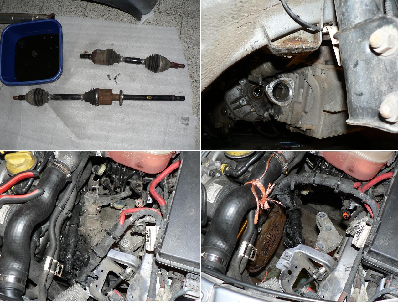 12. Vypustit olej z převodovky (otevřít jen spodní šroub a nechat odtéct), vyndat levou poloosu, odšroubovat přírubu na levé poloose a vyndat ji i s poloosou. Vyndat pravou poloosu. Zašpuntovat oba otvory na převodovce.