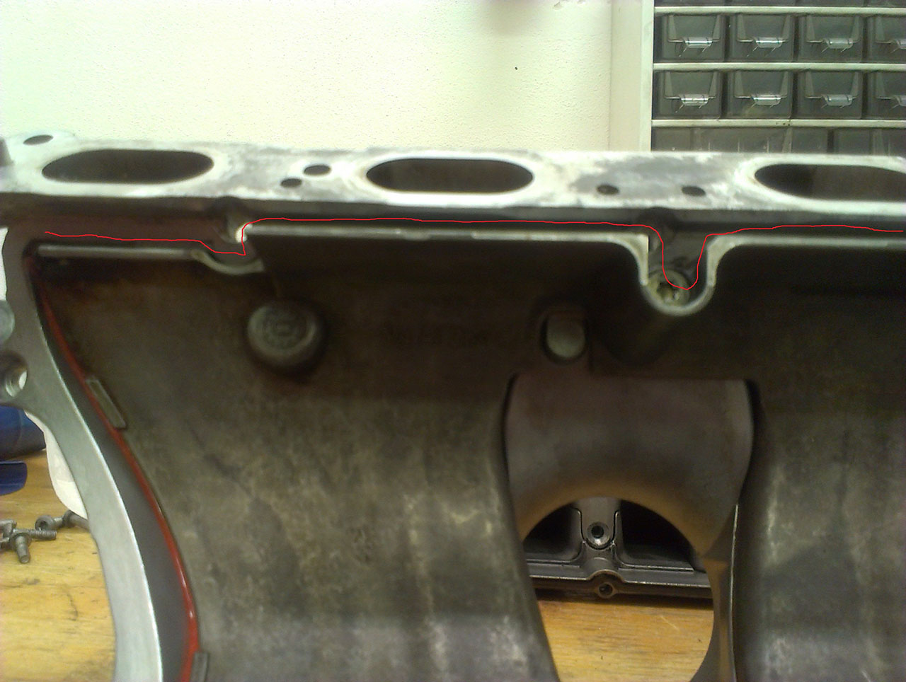 Vrátím se ještě ke klepající přepážce v sání. Tehdy jsem dal do auta celej blok sání z havarovanýho auta, kterej jsem jen rozpůlil a omrknul, vevnitř to už bylo spravovaný červeným silikonem. Vzhledem k tomu, že to byla jiná číselná varianta, než jsem tam měl, tak jsem se rozhodl, že u výměny rozvodů která mě čeká za 14 dní, nechám nasadit i to moje původní sání, který přetěsním. Dal jsem silikon všude tam kde jsem našel ten původní, ale zajímá mě, jestli to někdo dělal také a přetěsnil i tu horní hranu přepážky, která je nad vstupem do vstříků? tedy tu hranu přepážky, která je na fotce navrchu.