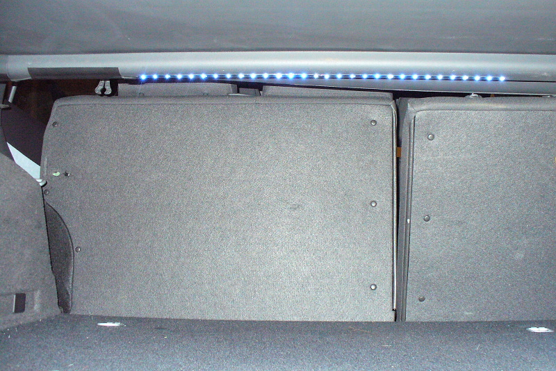 Osvětlení zadní části kufru : Led pásek nalepen na spodek rolety , aby šla někdy roleta vyndat je napájení řešeno přes konektorek do malé zásuvky , která je napájena proudem z lampičky kufru. Osvit nádhera , ještě časem dodělám posílení osvitu v přední části kufru . Buď z hora - nad hlavou , nebo naboku , jako Dimi .
