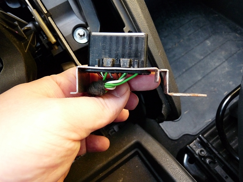 Diagnostický konektor je z původního uchycení (viz obr. 1) připevněn do konzolky, kde je otočen o 180° (obr.2). Konzolka je cca 17 mm vysoká, je umístěna nad původním otvorem a připevněna je šroubkem do díry, ve kterém byla původně kabelová příchytka pro svazek kabelů k diagnostické zásuvce.