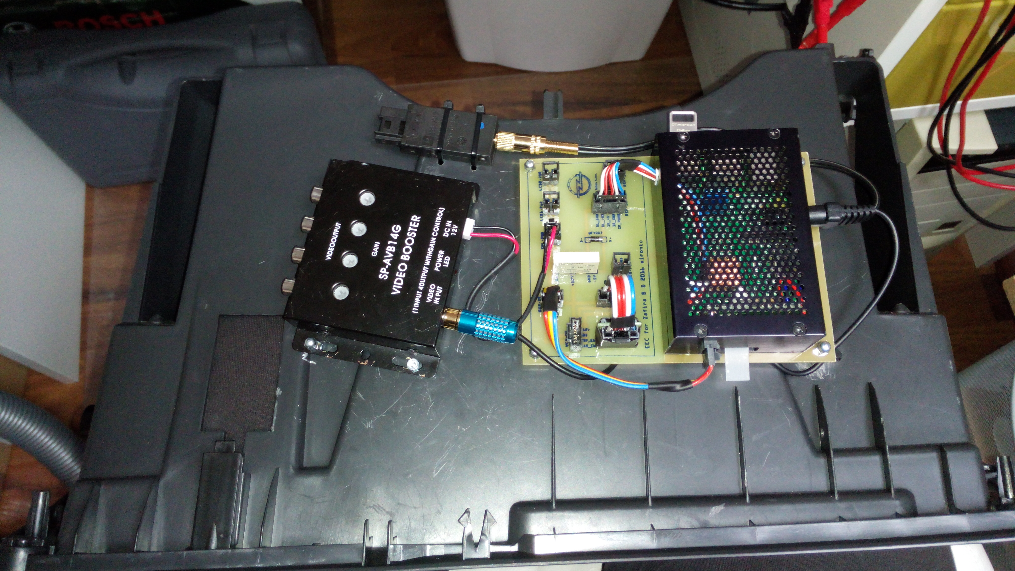 RaspPi som osadil na dosku plosneho spoja EEC a ako celok som to nasledne pripevnil spolu s CVBS splitterom cez distancne stlpiky na vrchnu stranu schranky spolujazdca.