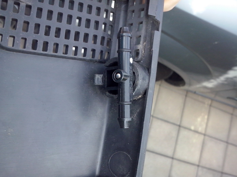 po odklopení plastu bolo treba vytiahnuť prívodnú hadičku,tá bola nasadená nacvakávacou spojkou ku tryske,odpojiť išla ľahko,ostatné spoje hadičky a trysky boli len nasucho,čiže guma šla dole trošku ťažšie,ale s trochou sily to šlo,guma vydrží