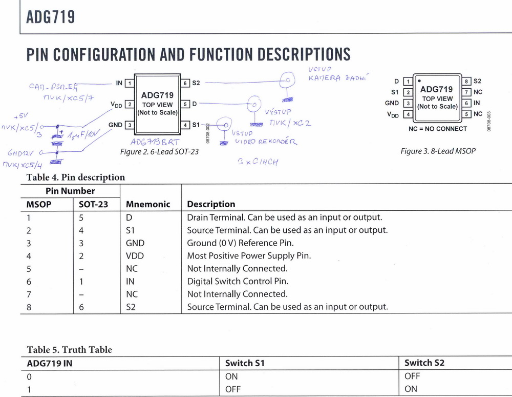 Konstrukce videopřepínače bude nutně vyžadovat návrh a výrobu plošného spoje - ADG719 je malá blecha. Návrh nebude nic extra složitého a výrobu plošného spoje lze za velmi levný peníz objednat zde: http://www.tistaky.cz/ .