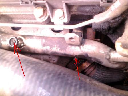 Přes zimu jsem si všiml mírného úniku vody a jelikož se mi zdálo, že se to zhoršuje, otevřel jsem kapotu, sundal kryt motoru a hle... jak je vidět z fotky, uniká to podél imbusového šroubu a kape dolu.