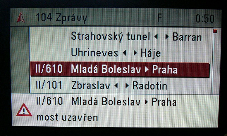Takže bude možné počeštit i dopravní hlášení TMC (Traffic Message Channel / Kanál dopravních zpráv). Vzhledem k faktu, že TMC je normalizováno normou ISO 14819 a v její druhé části, která jako jediná byla preložena do češtiny, jsou uvedeny všechny události a oznamení, které jsou také normalizované, doufám, že se mi podaří tyto vyzobnout z jiné navigace. V nejhorším případě si koupím normu v PDF a texty vyzobu. TMC hlášení jsou součástí navigačního CD/DVD s map. podklady, tzn. není nutné zasahovat do SW navigace či displeje.