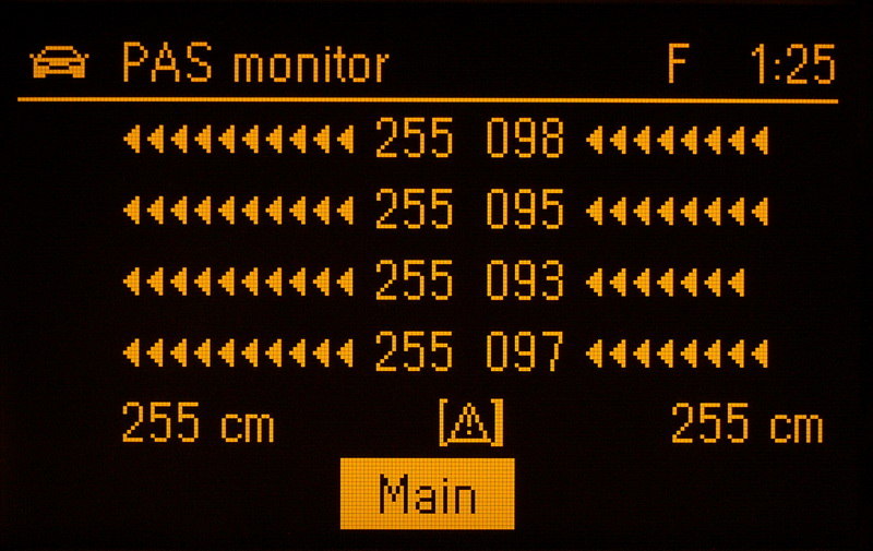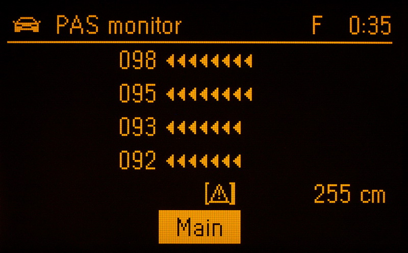 PAS monitor dle počtu připojených snímačů zobrazuje okno se všemi měřenými vzdálenostmi zobrazenými v číselné podobě a také grafickou formou „tancujících“ šipek (progress bar). Zobrazených šipek je max. deset, přičemž každá šipka odpovídá 10 cm; zobrazení se aktualizje po 333 ms. Min. vzdálenost, kterou ŘJ PAS ukazuje je 20 cm, tj. pokud PAS monitor neukazuje žádnou šipku, je vzdálenost k překážce <= 20 cm, při jedné šipce <= 30 cm, dvě šipky <= 40 cm, atd.. Dále je v okně zobrazena výsledná vzdálenost od překážky vpředu a vzadu (asi to je minimum z měřených vzdáleností) a také status ŘJ PASu; pokud PAS nepracuje správně nebo je chyba v nějakém snímači, zobrazí se vykřičník.