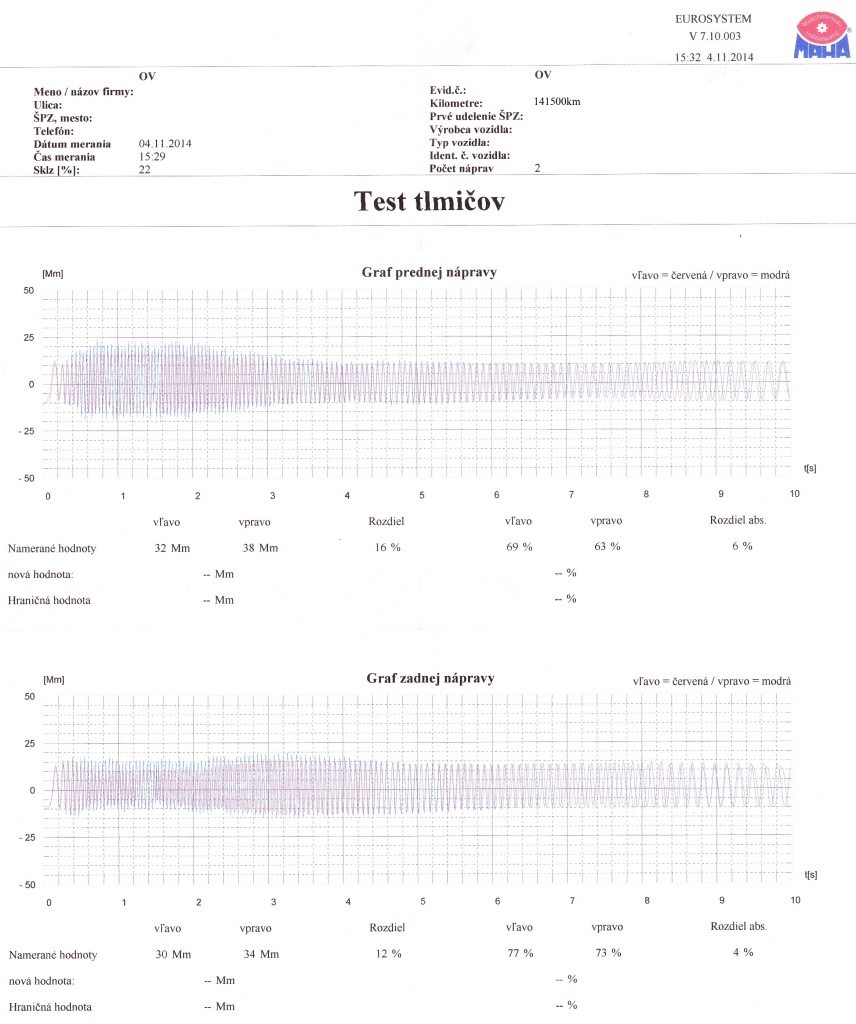 Tak dnes test tlmičov na STK. Mám IDS+, trošku ma zaskočili hodnoty, keď som tu čítal že tieto tlmiče majú vydržať vcelku dosť a ja mám predné už 63-69%. Auto bolo 9 rokov v nemecku kde majú predsalen lepšie cesty ako tu, tak som dúfal že budú v lepšom stave trošku. Ale kto vie ako sa na ňom jazdilo...
