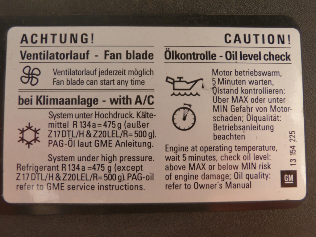 Dobrý den.Pánové mám dotaz k náplni klimatizace Zafira b 1.9-110kw.Jedná se mi o štítek,kde je uvedený typ plnivá a gramáž plnivá. Fotečka by potěšila.Rozsekal jsem předek o srnku + chladič klimatizace.Dík předem