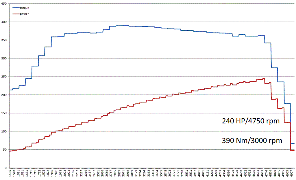 Turbo aj zvody su z Alfy 159 2,4 210Ps. Turbo je Garrett GTB2056.Krutiaci moment by sa dal v strednych otackach navysit,ale s ohladom na prevodovku a zotrvacnik je to 390Nm.